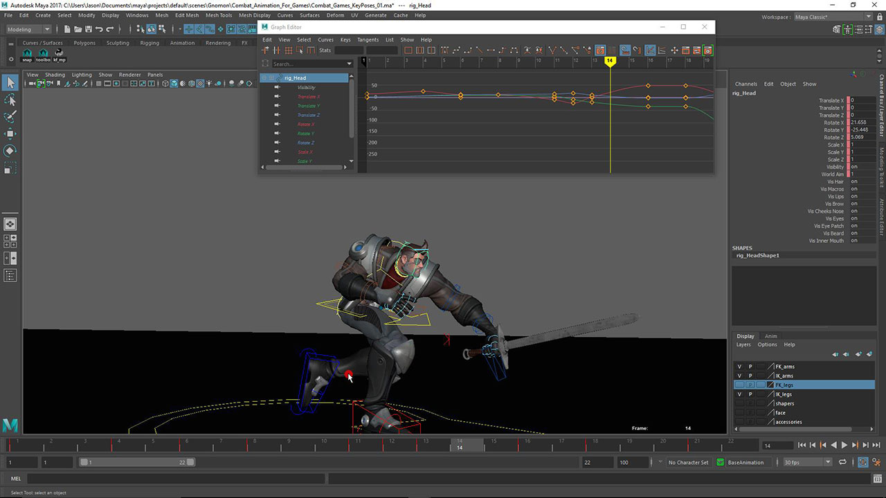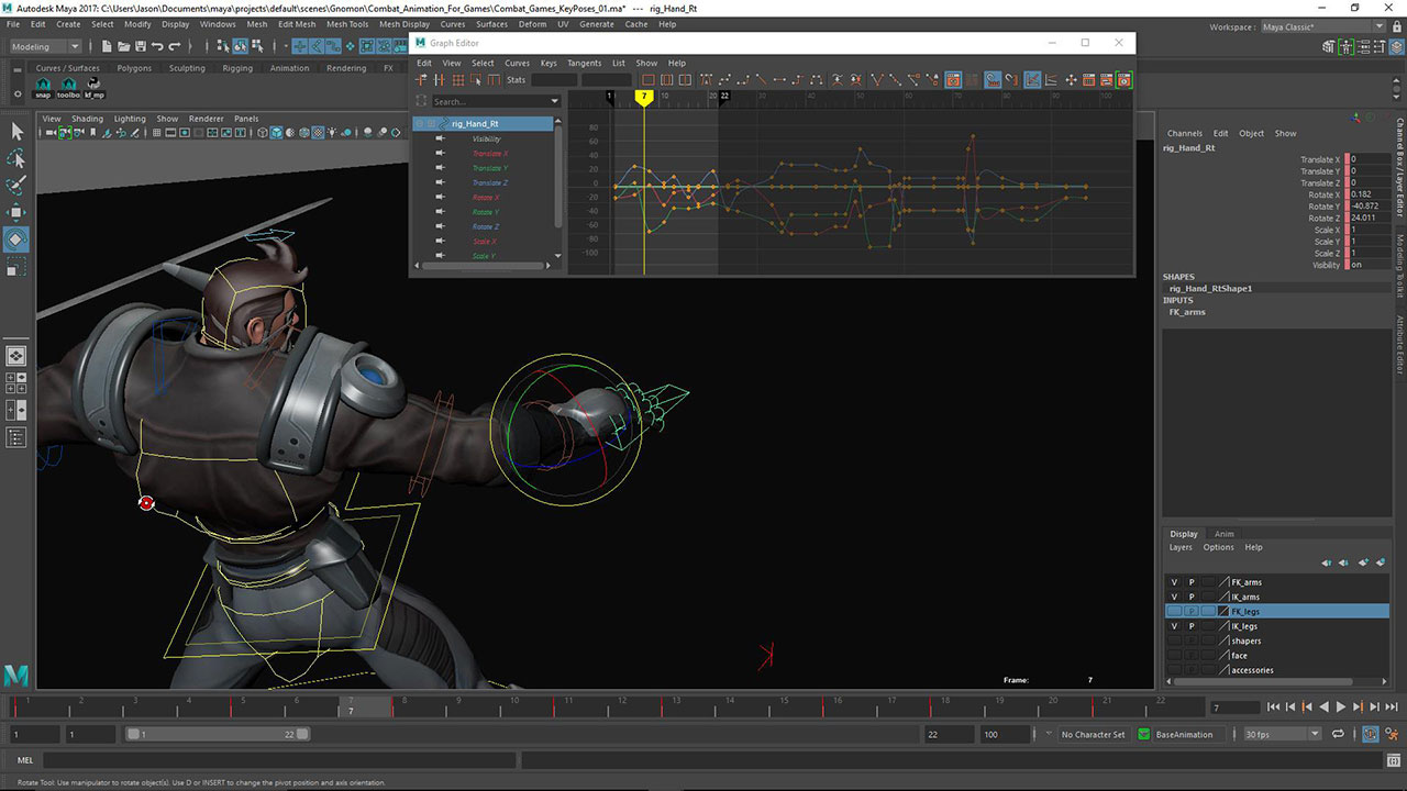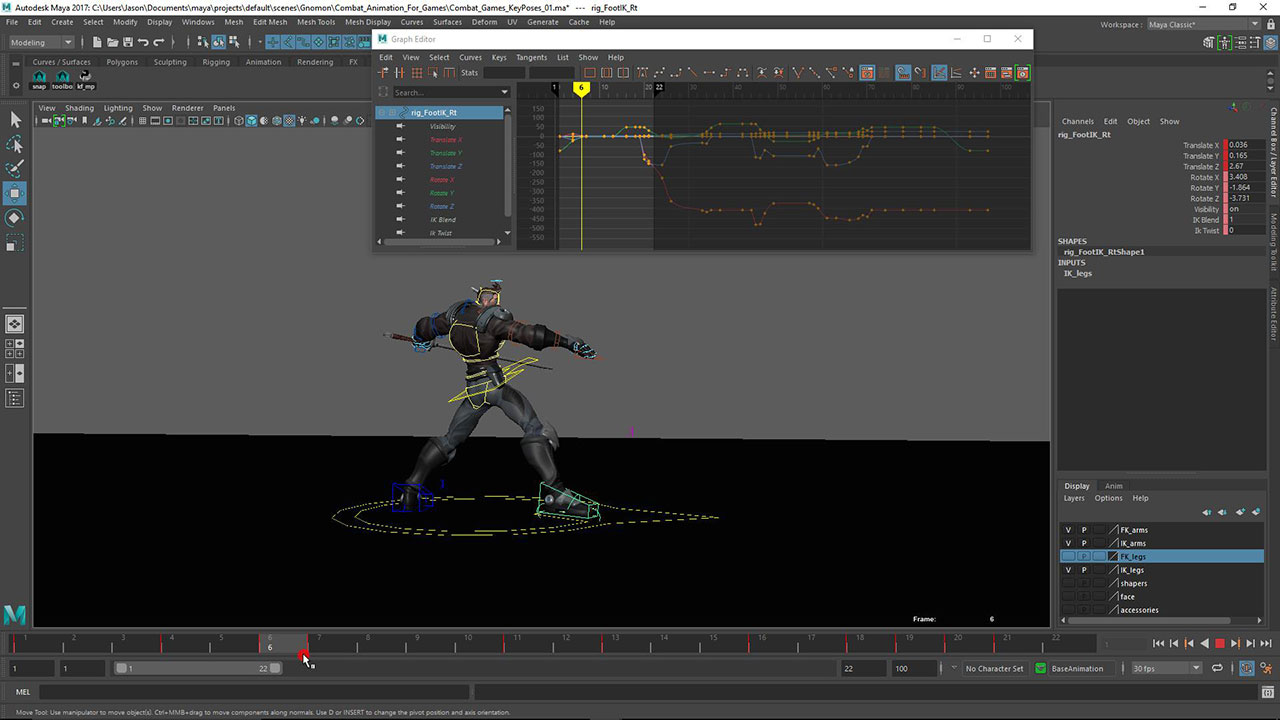 This tutorial teaches how to create dynamic and exciting combat animations in a step-by-step method that is used by many professional animators. The core foundations of combat are covered such as strong posing, aggressive timing and appeal. Riot Games’ Senior Animator Jason Shum shares his process from the initial idea stage to final polish. He begins with an introduction to the Gnomon Bounty Hunter rig in Maya, followed by a lecture on the concepts of successful combat including personality, energy and flow. He then works through generating a good idea and executing it via first, second and polish passes. Students will gain a strong understanding of how to ideate and build a combat animation using a workflow that includes the use of reference, key poses, retiming, breakdown keys and arcs.