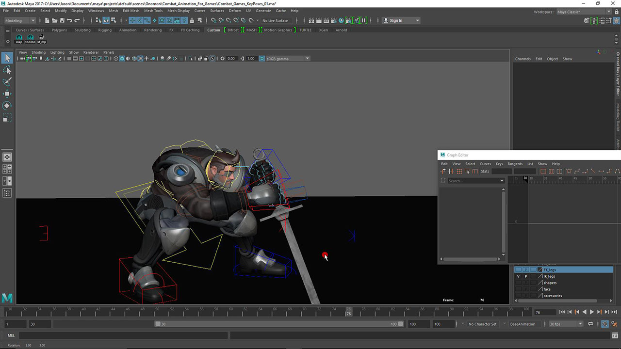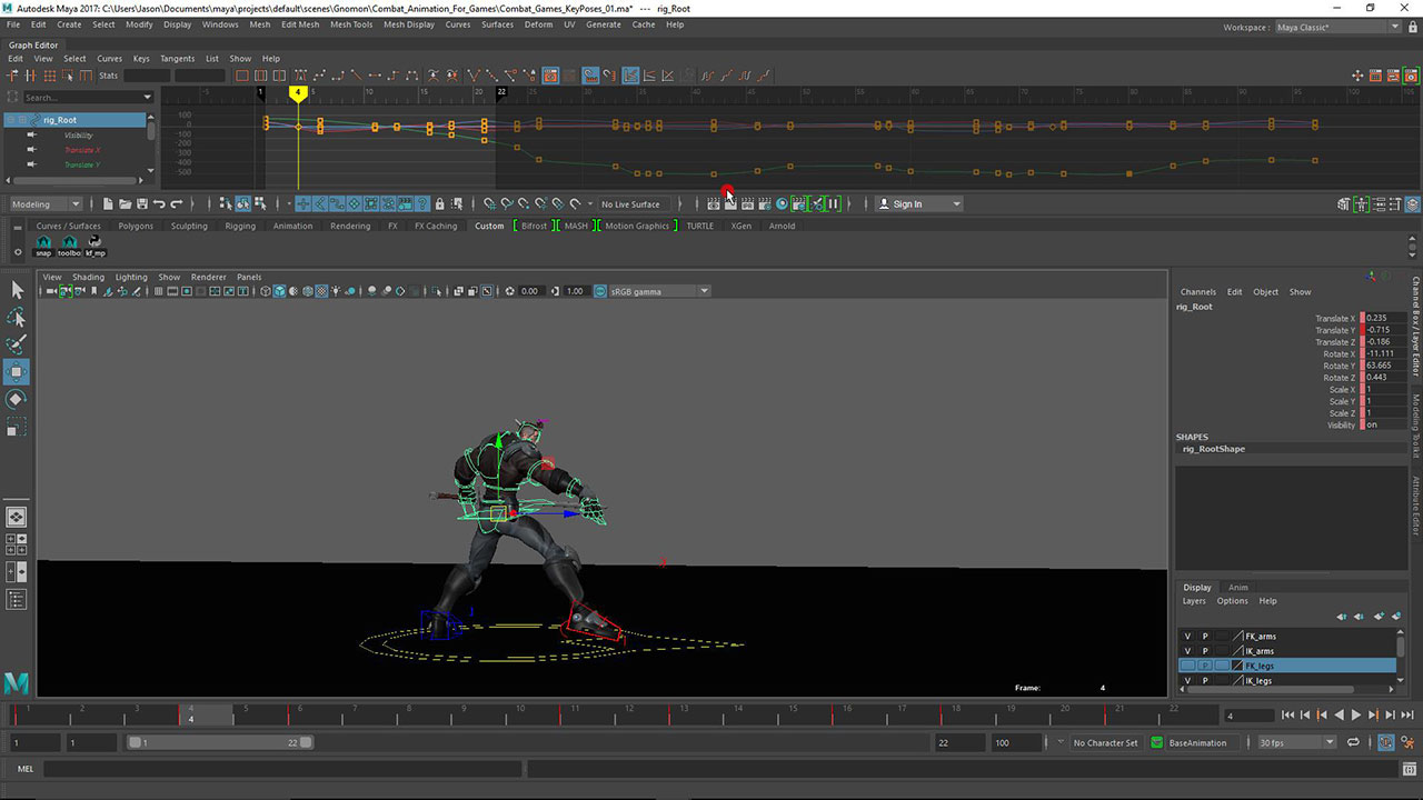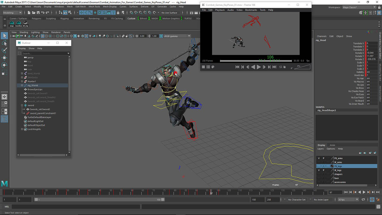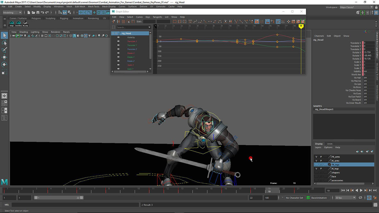 This tutorial teaches how to create dynamic and exciting combat animations in a step-by-step method that is used by many professional animators. The core foundations of combat are covered such as strong posing, aggressive timing and appeal. Riot Games’ Senior Animator Jason Shum shares his process from the initial idea stage to final polish. He begins with an introduction to the Gnomon Bounty Hunter rig in Maya, followed by a lecture on the concepts of successful combat including personality, energy and flow. He then works through generating a good idea and executing it via first, second and polish passes. Students will gain a strong understanding of how to ideate and build a combat animation using a workflow that includes the use of reference, key poses, retiming, breakdown keys and arcs.