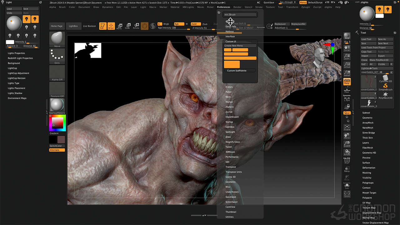 This detailed workshop opens with a quickstart sculpting tutorial where Maddie lays the groundwork for basic navigation and sculpting by blocking a Goblin bust using Dynamesh. Throughout subsequent chapters, she revisits this creature to create a full-body creature sculpt with fine details, including wrinkles and pores.