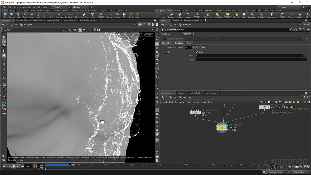 The simulation of realistic whitewater poses significant challenges, especially at large scales. Over the course of several lessons, you’ll explore a range of techniques to achieve realistic motion, from simulating an airfield to modifying the dynamics of millions of particles using various methods based on real-life observations to mimic the behavior of water at different densities. Finally, you will look-dev and render the shot using Karma within the Solaris USD context, making sure each component of the water is tightly integrated. By splitting the various necessary passes, you can easily put together a final comp using Nuke.