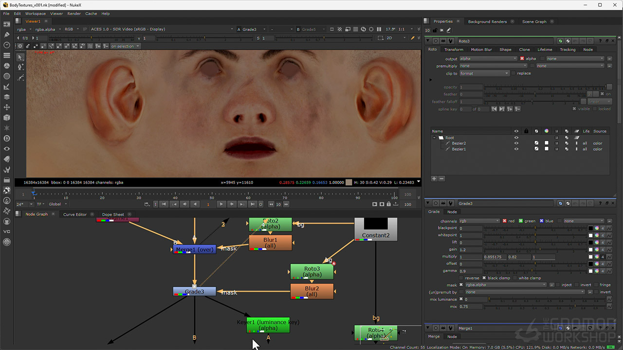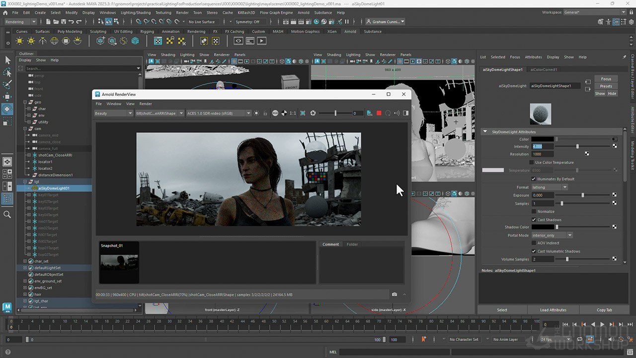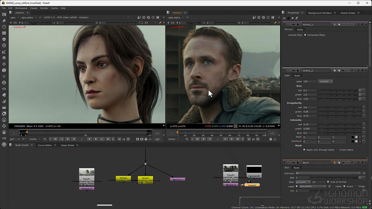 From there, the workshop dives into the rendering using Arnold, discussing render settings, depth of field, and how to create render passes. Then jumping into Nuke, Graham assembles the render passes, splits out the light AOVs, and shows how to adjust light colors and intensities. He also details how to add atmosphere, how to use cryptomattes to fine-tune the results, how to add post effects, and lastly, how to apply a final color grade to match his chosen movie reference.