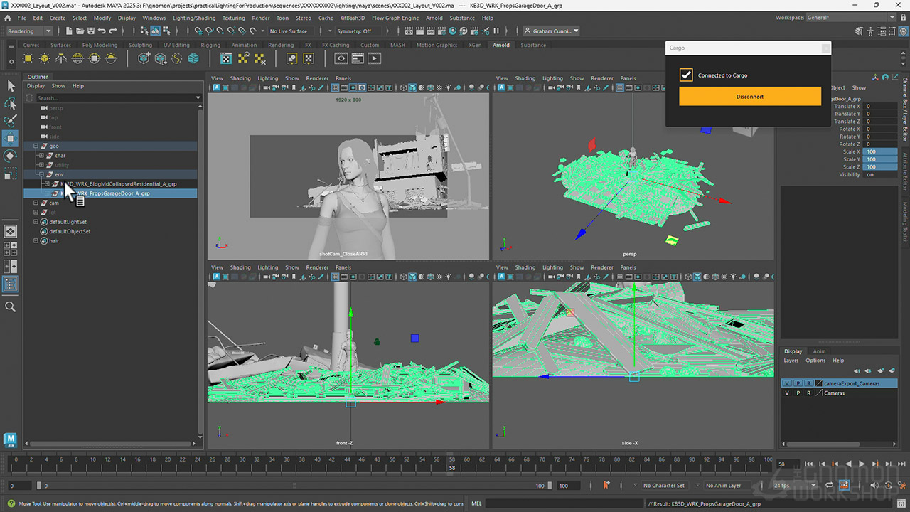 This workshop utilizes the Female Explorer Character from 3DScanStore, the Wreckage Kit from KitBash3D, as well as assets from KitBash3D’s Cargo.