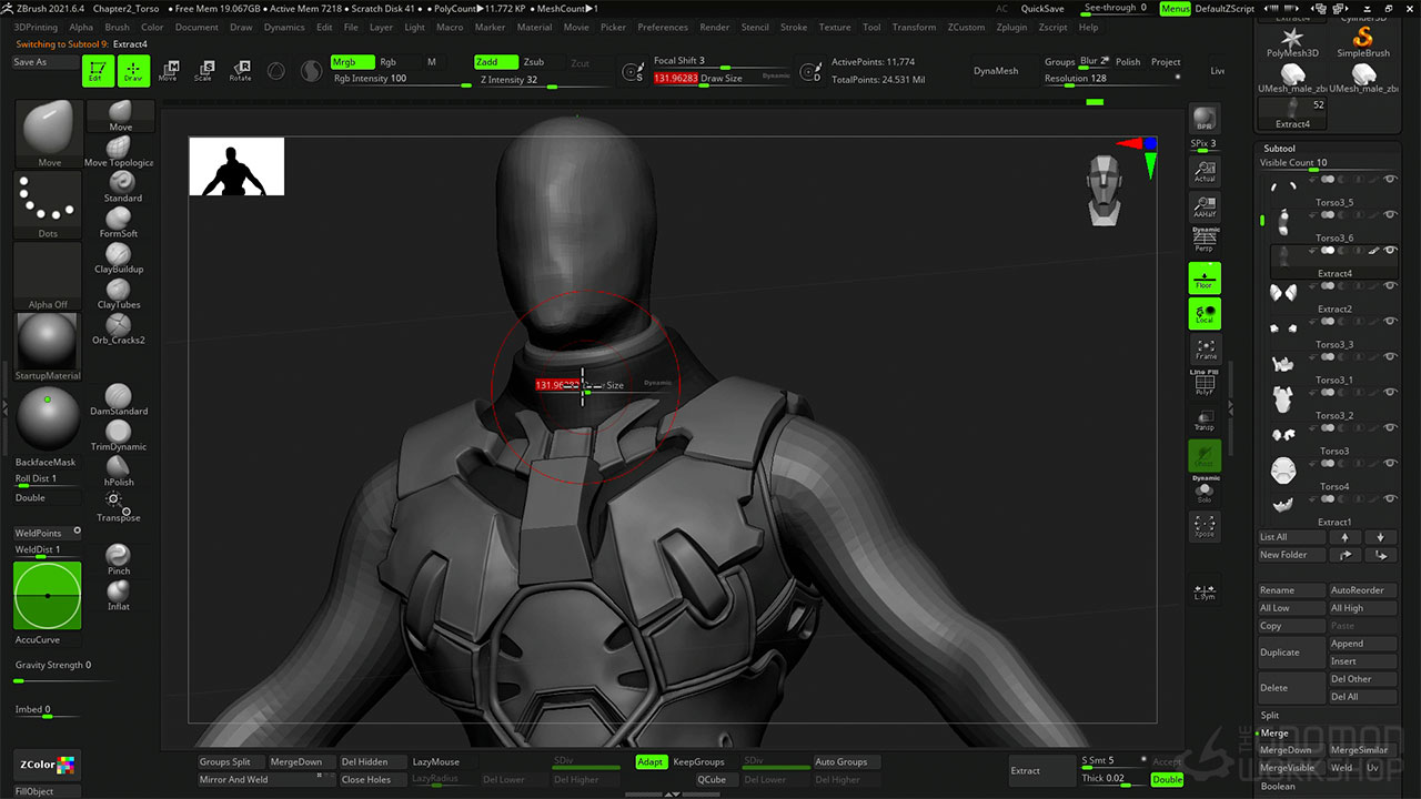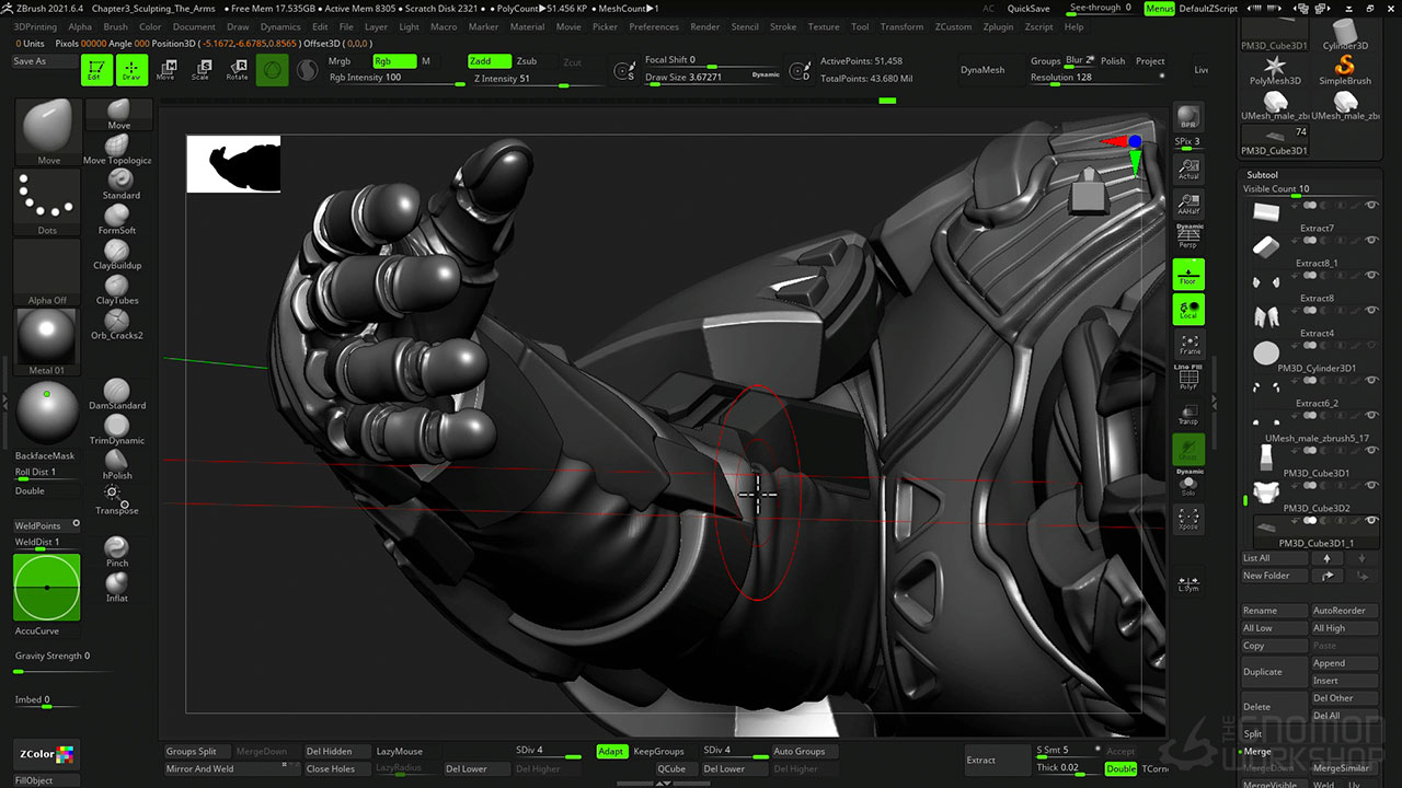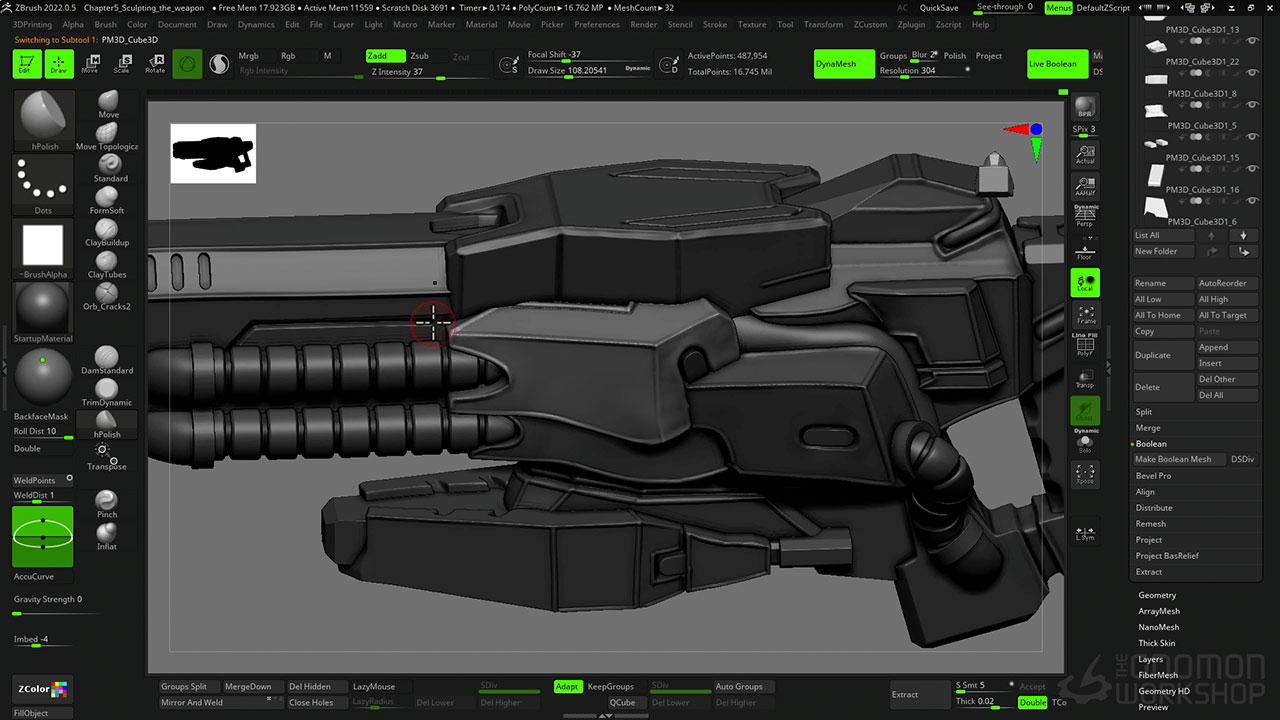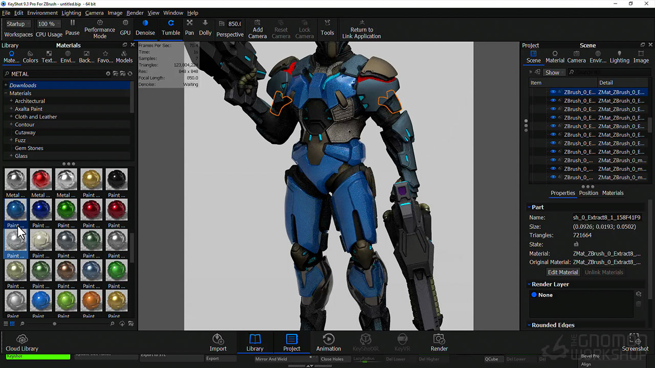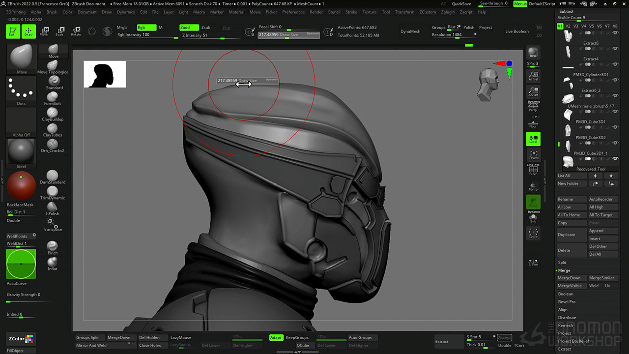 The workshop covers the entire process of sculpting for miniatures, from considering the initial scales to using DynaMesh, ZRemesher, Transpose Master, ZModeller, and lastly, KeyShot for rendering.