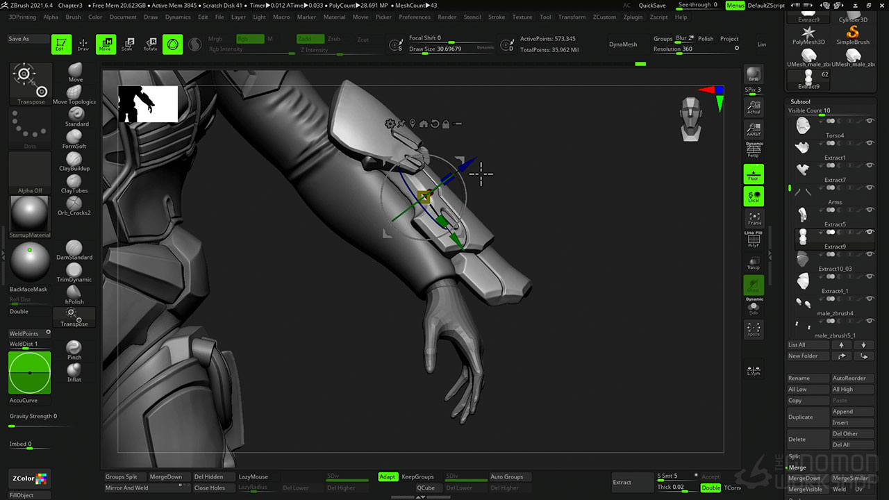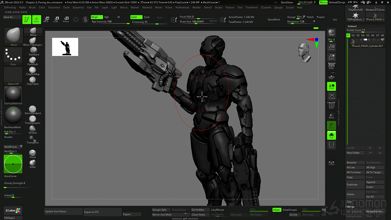 Provided as a downloadable resource with this workshop are the STL of the decimated high poly model, the ZTL of the T-pose with all the Subtools, plus the ZTL of the final posed model with Subtools.