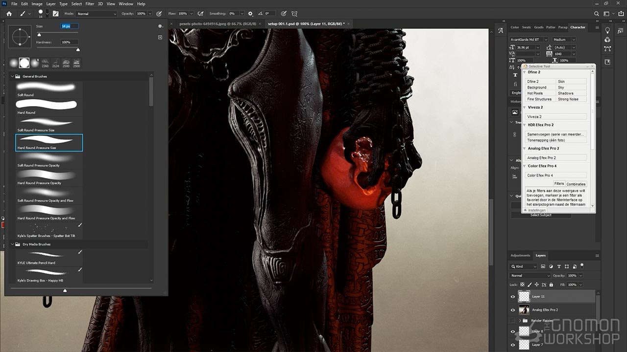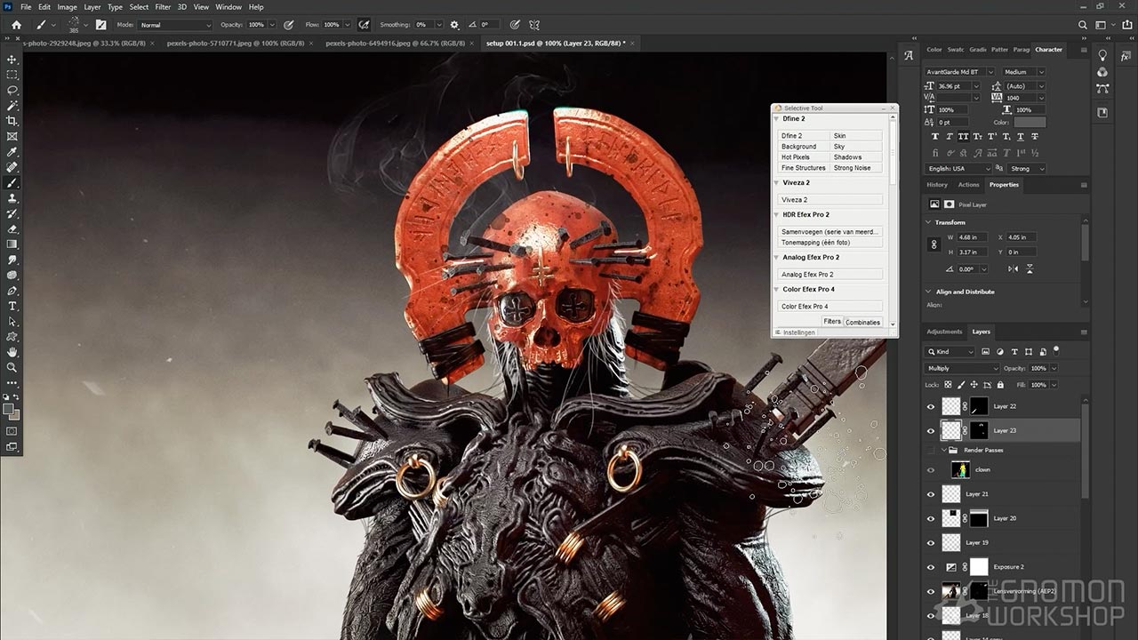 This 2.5-hour workshop reveals how Maarten builds up his characters from scratch, using custom brushes to his advantage. He’ll share his Marvelous Designer process for setting up fabrics quickly and effectively and will detail his KeyShot rendering process, giving a behind-the-scenes look at how Maarten sets up his lighting and applies an HDRI and geometry. The last stage walks through his signature post-production process on the raw KeyShot render, using Photoshop for the final touches.