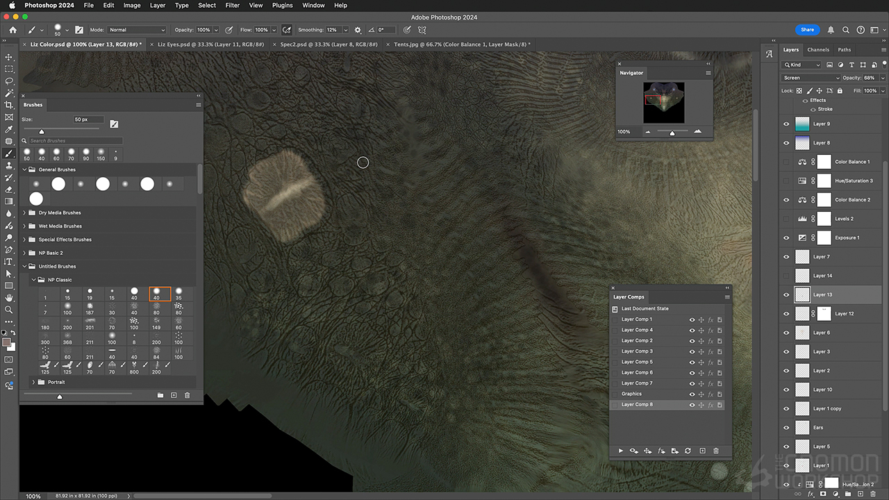 In Volume 1, Neville presented how to create designs that can be turned into practical makeup, working from head scan data to demonstrate how to work on top of it in ZBrush, the same as if you were working with a physical life cast. In this second volume, Neville takes the two character designs created in Vol. 1 and, using digital tools, he demonstrates how to apply color, texture, and materials that accurately represent not only the final look of a character but also the real-world materials that would be used in practical makeup effects, such as foam latex, silicone, and paint.