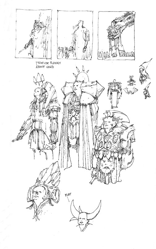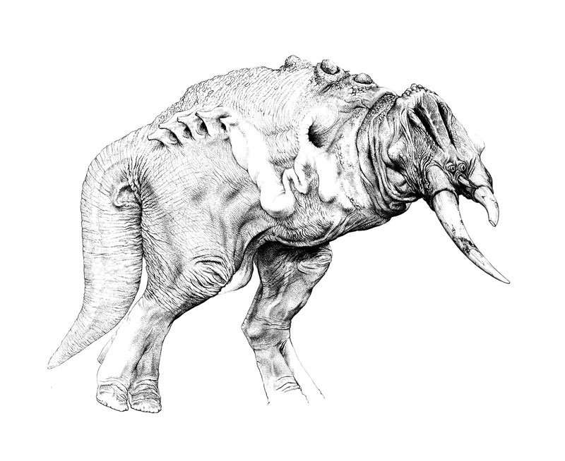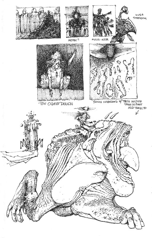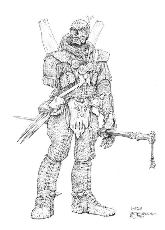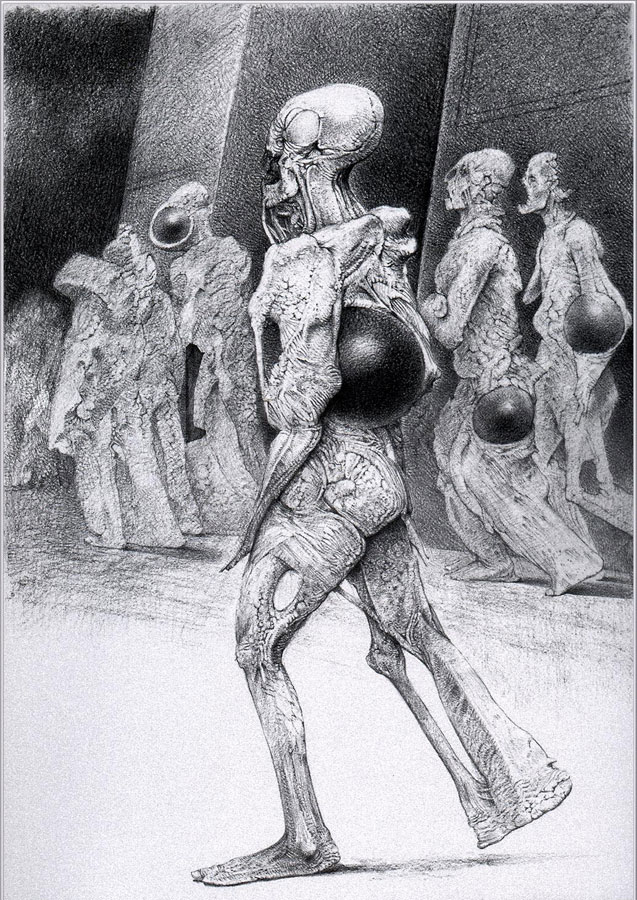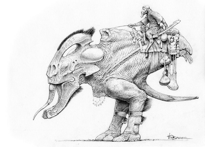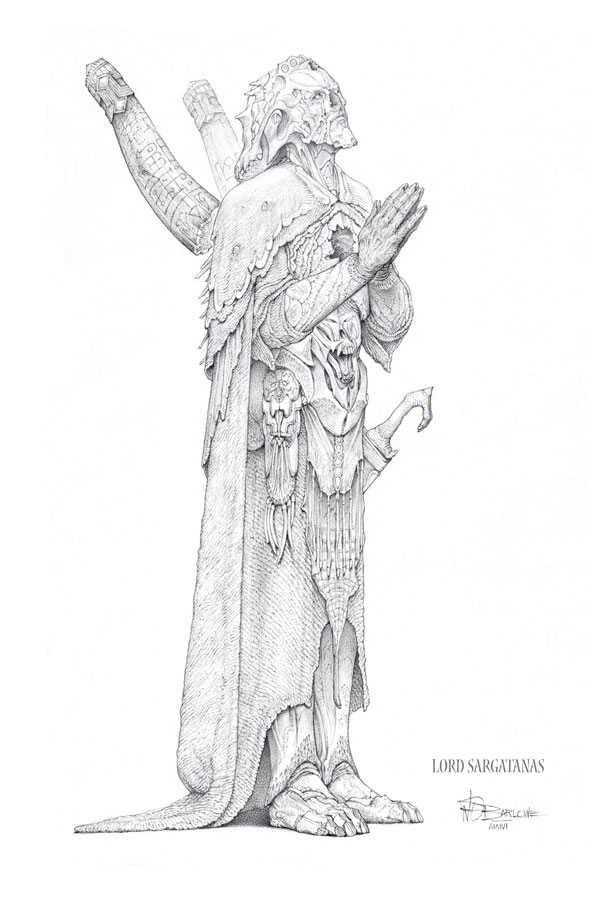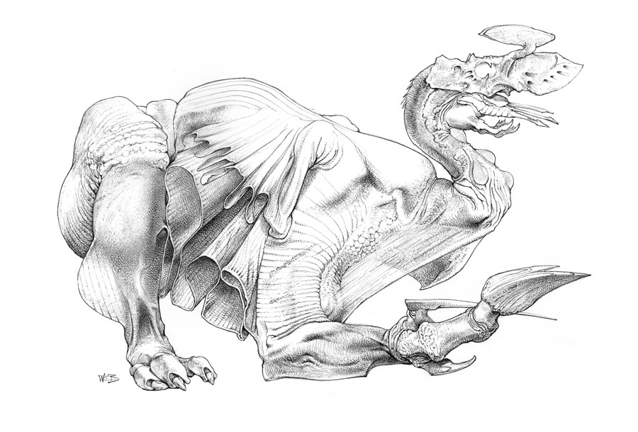 " Watching Wayne Barlowe draw is an intriguing experience. Wayne sets down the lightest of pencil lines as a guide and then, without hesitation, begins the meticulous process of rendering the most astonishingly detailed pencil drawings. As his preparatory lines are so light as to be practically invisible, watching the drawings materialize is akin to developing black and white prints. They simply appear, as if the pencil was a scalpel, cutting away the paper to reveal the images underneath.For someone like myself, who has not the slightest clue where a drawing is going when he begins, there's something alchemical about Wayne's expertise."
