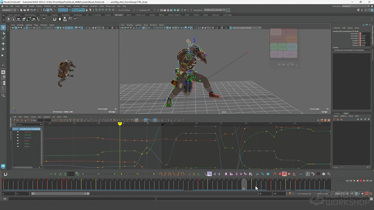 This comprehensive workshop details the complete pipeline to create a game-ready recall animation, from ideation through the final polishing phase. Covering a variety of techniques, including snappy timing, strong poses, and moments of pause, Benjamin instructs how to achieve a stylized look efficiently. He demonstrates his personal ideation methods using Clip Studio Paint to sketch, and details the tools he uses within the animBot plugin for Maya to achieve a faster workflow.