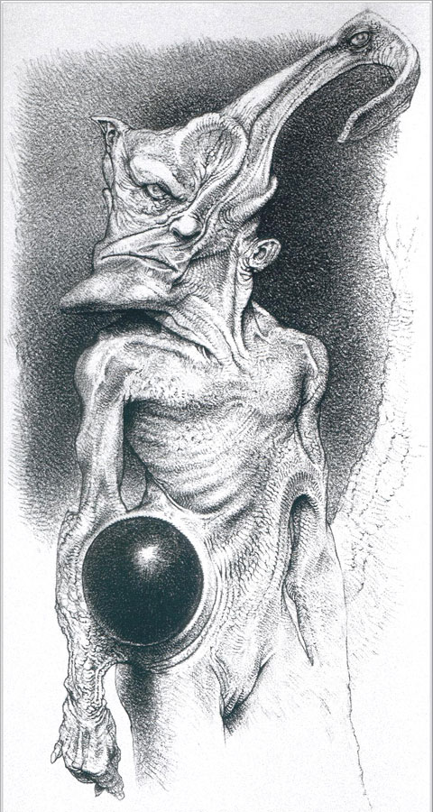 " Watching Wayne Barlowe draw is an intriguing experience. Wayne sets down the lightest of pencil lines as a guide and then, without hesitation, begins the meticulous process of rendering the most astonishingly detailed pencil drawings. As his preparatory lines are so light as to be practically invisible, watching the drawings materialize is akin to developing black and white prints. They simply appear, as if the pencil was a scalpel, cutting away the paper to reveal the images underneath.For someone like myself, who has not the slightest clue where a drawing is going when he begins, there's something alchemical about Wayne's expertise."